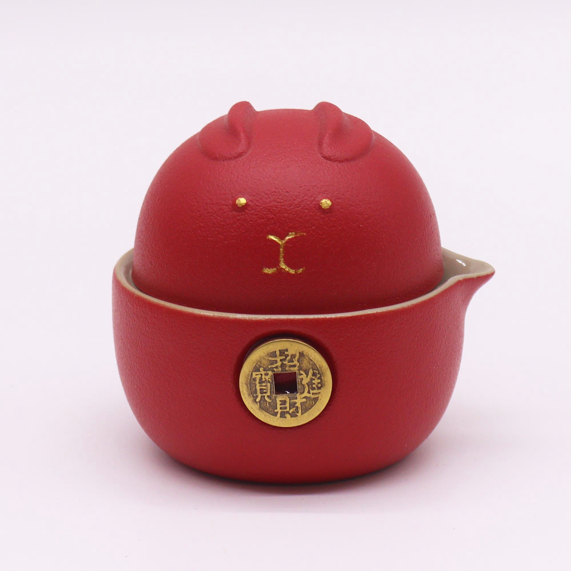Tekanden har en livlig rød farve med et elegant gyldent pengemønster, der repræsenterer rigdom og positiv formue. Med sin ergonomiske tud og låg garanterer den en fejlfri hældeoplevelse. Hver kop er udsmykket med et charmerende katteansigt, og når de stables oven på tekanden, skaber de det finurlige udseende af en pengekat, hvilket tilføjer en sjov og legende stemning til sættet.