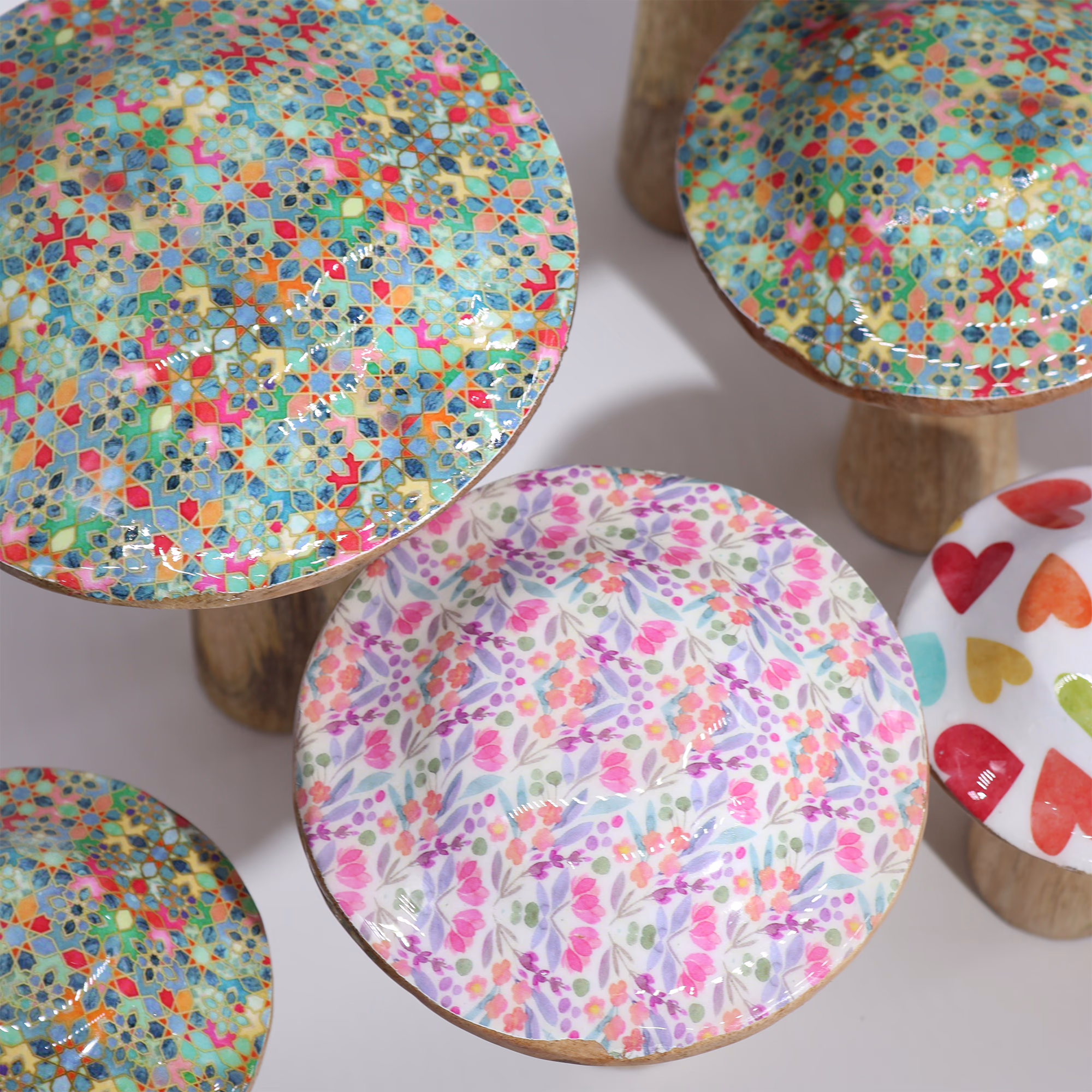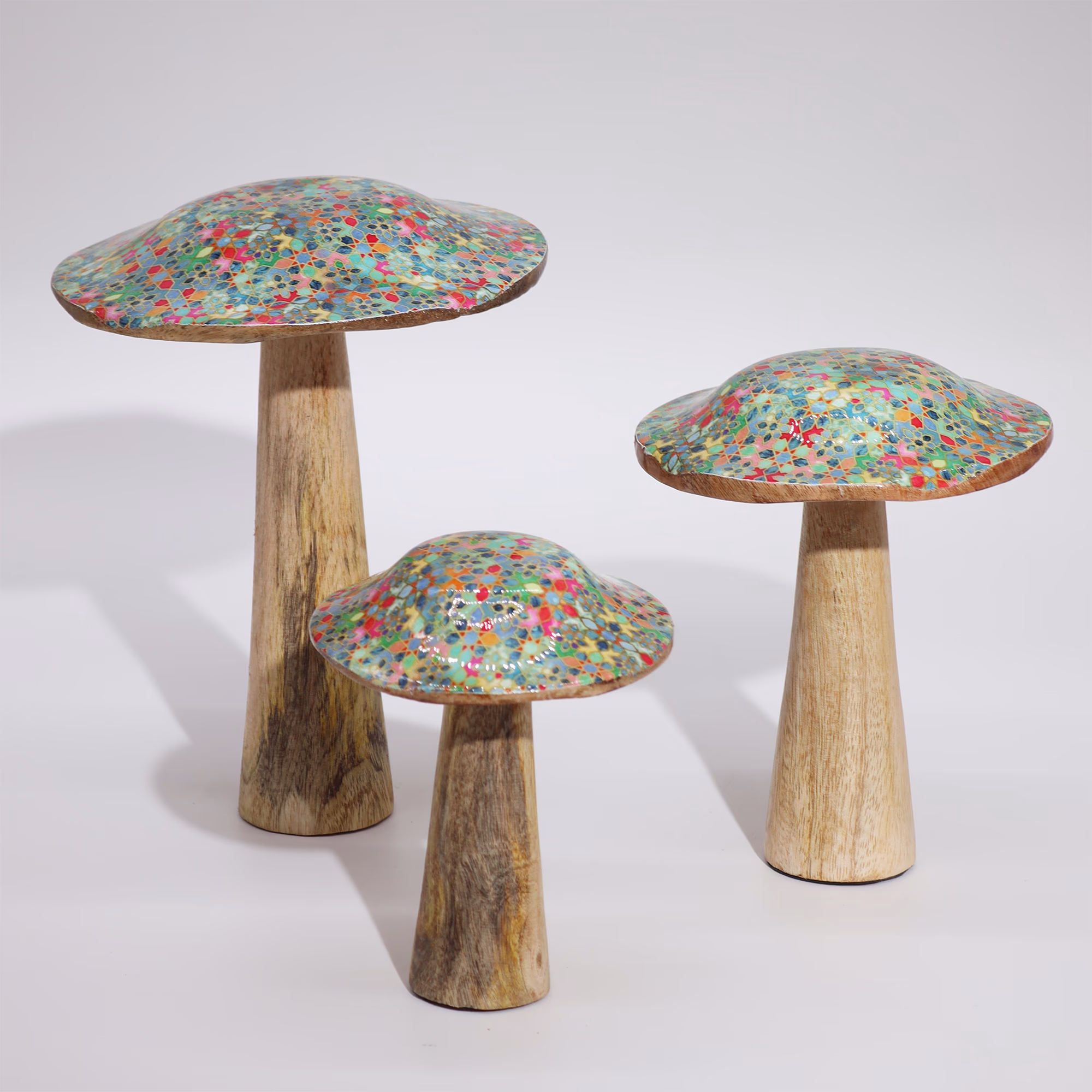 This medium-sized wooden mushroom features a vibrant Mediterranean Tile pattern that brings a bold, colourful element to any nature-themed display.
