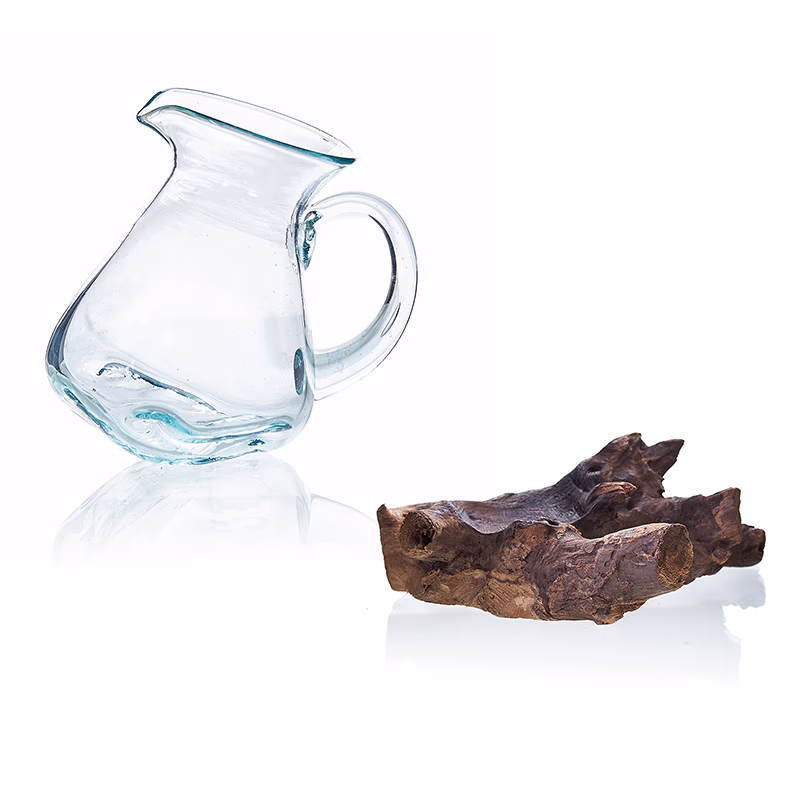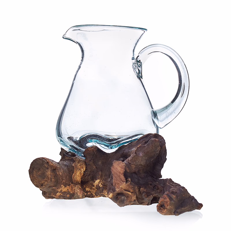 Met de hand vervaardigd in Bali van gerecycled glas en Balinees Gamal-hout. Deze prachtige glazen Water Kan brengt het beste van twee werelden samen: natuurlijk en door de mens gemaakt; aards en chic; praktisch en spiritueel.